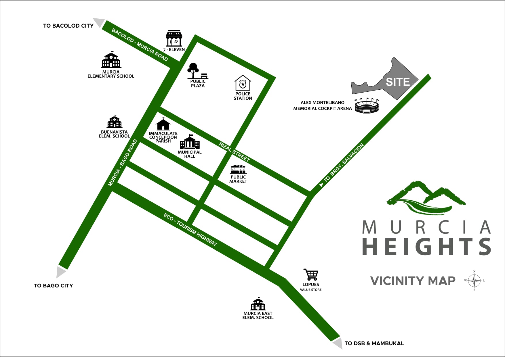 -From Bacolod South Terminal, take a Ceres Bus going to Don Salvador Benedicto, then stop at the road of Murcia Public Plaza, from there take tricyle going to Murcia Heights site.
